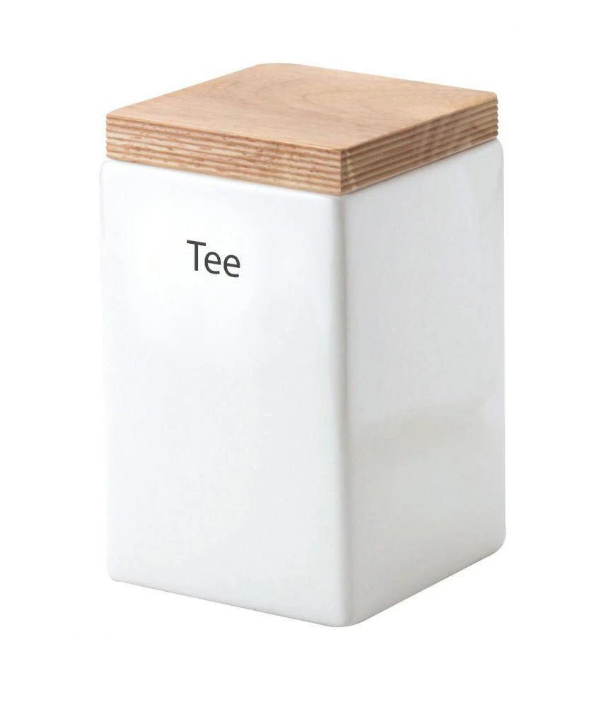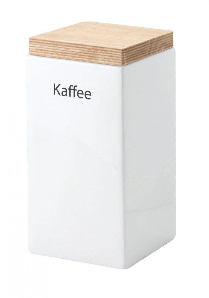 Vorratsdose quadratisch aus Keramik mit Holzdeckel. Deckel mit fest schließendem Silikonring. Perfekt für Kaffee, Tee oder Zucker.