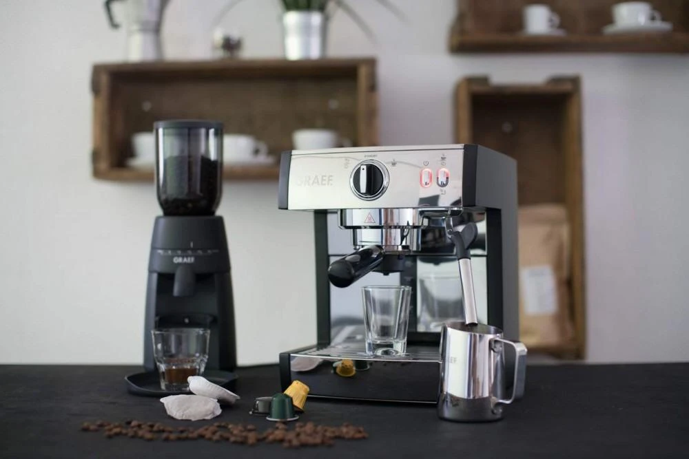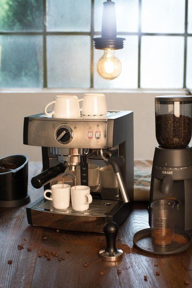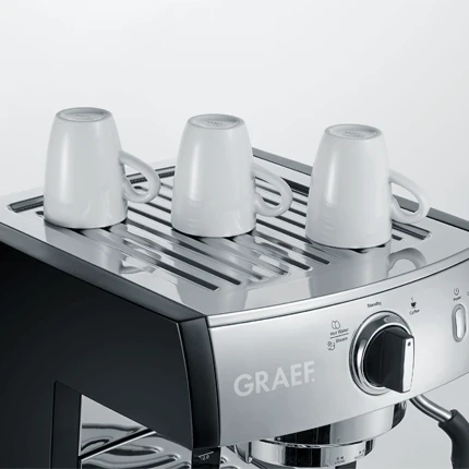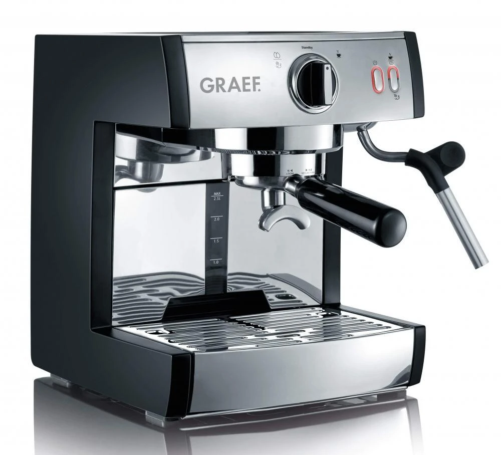 GRAEF Espressoautomaten sie beherrschen, geht auf das Jahr 1901 zurück. 6 bis 8 Gramm fein gemahlenes Kaffeepulver werden unter hohem Druck (9 bar) in ca. 23 Sekunden in der Maschine extrahiert. Das Wasser hat dabei eine Temperatur von 89-96°C. Bei Espressoautomaten wird das Kaffeepulver von Hand in das herausnehmbare Sieb gefüllt und gepresst, ein Vorgang, der als „Tampen“ bezeichnet wird.