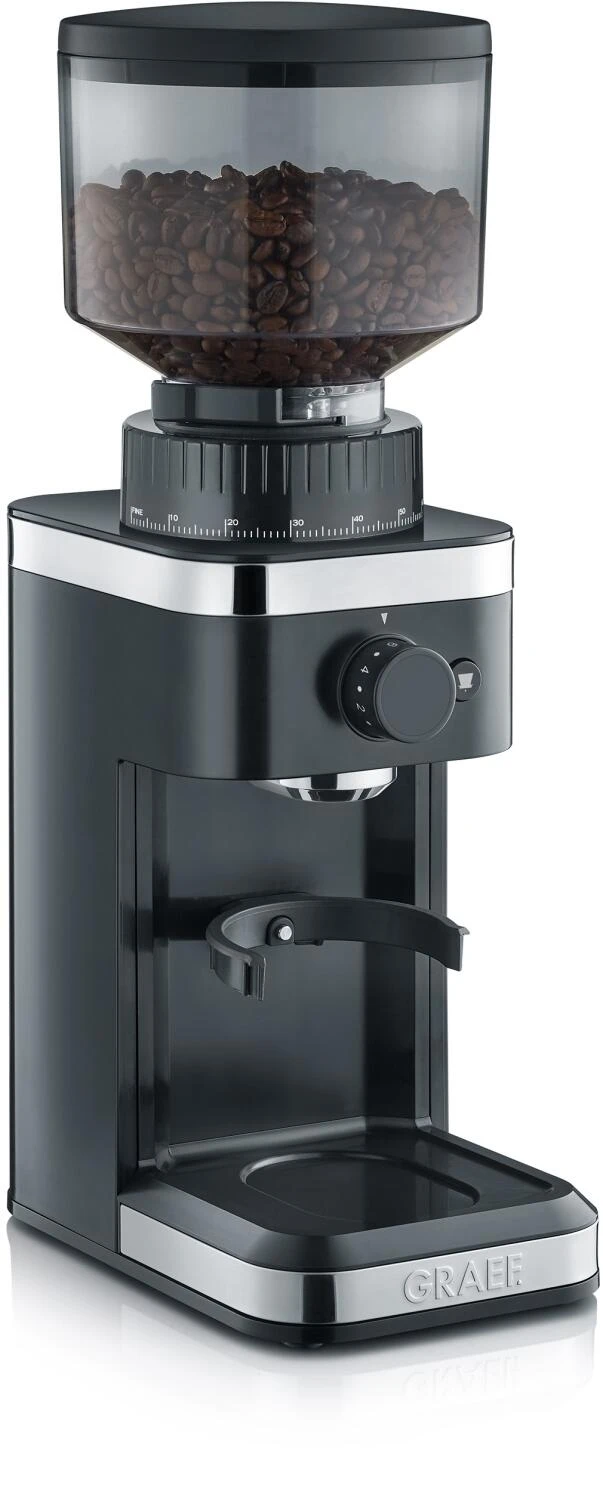Die Kaffeemühle CM 502 von GRAEF besitzt ein Edelstahl-Kegelmahlwerk. Das Kegelmahlwerk hat den Vorteil, durch geringe Drehzahlen keine oder wenig Hitze zu erzeugen, dadurch ist das Mahlen aromaschonender. Der auf 140 Stufen einstellbare Mahlgrad bildet die Grundlage für den individuellen Kaffeegenuss. Es kann direkt in den Siebträger, den Kaffeefilter oder den Kaffeemehlbehälter gemahlen werden. Dank der ’Grind on Demand’-Funktion, also die automatischen Mahlfunktion für Siebträger, stimmen Sie die Kaffeemehlmenge ganz individuell auf Ihre Bedürfnisse ab. Sie halten den Siebträger einfach so lange an den Kontaktschalter bis er voll ist. Es gibt nichts über frisch gemahlene Kaffeebohnen mit vollstem Aroma.