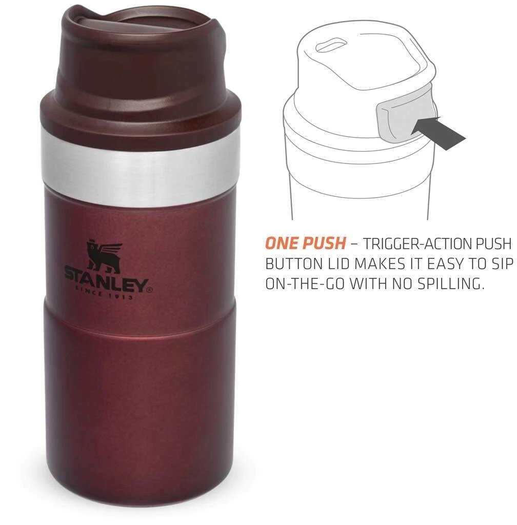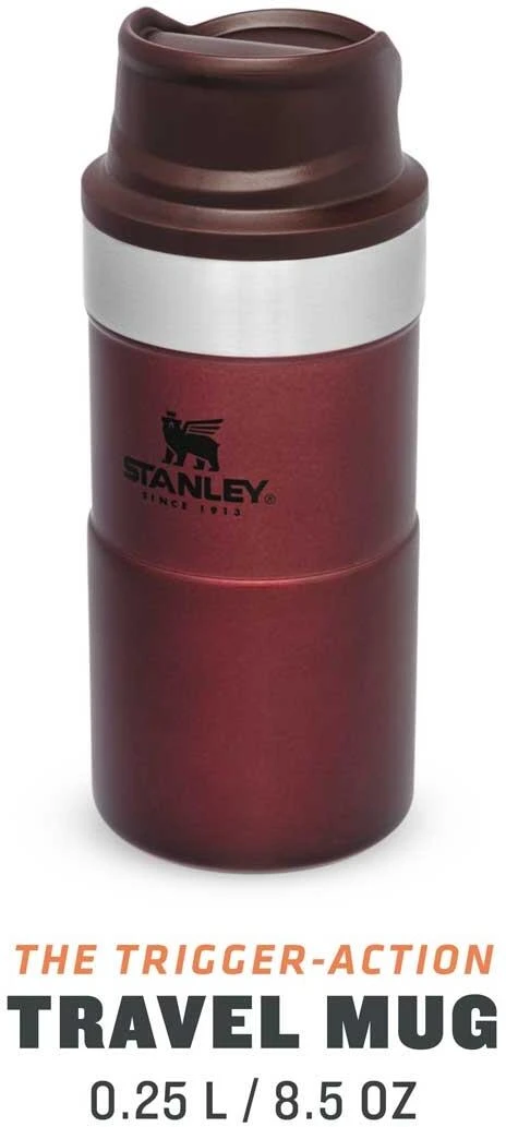 Mit der Slim Line Version des TRIGGER-ACTION TRAVEL MUG führt Stanley eine überarbeitete Version der einhändig bedienbaren Becher ein. Durch das neue, schlankere Design liegt der Becher noch angenehmer in der Hand und die 250ml-Variante passt unter die meisten Kaffee-Automaten. Das Drücken der großen und sehr leichtgängigen Taste zum Aktivieren der Trinköffnung mit einer Hand macht Trinken – on the go – zum Vergnügen. Der rote Trinkbecher aus rostfreiem 18/8-Edelstahl mit Vakuumisolierung besitzt ein Fassungsvermögen von 250 ml und hält Getränke bis zu 3 Stunden heiß oder 4 Stunden gekühlt. Der TRIGGER-ACTION TRAVEL MUG ist komplett spülmaschinenfest, auslaufsicher und passt in gängige PKW-Getränkehalter. BPA-frei.