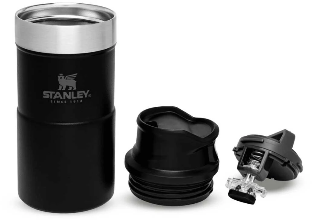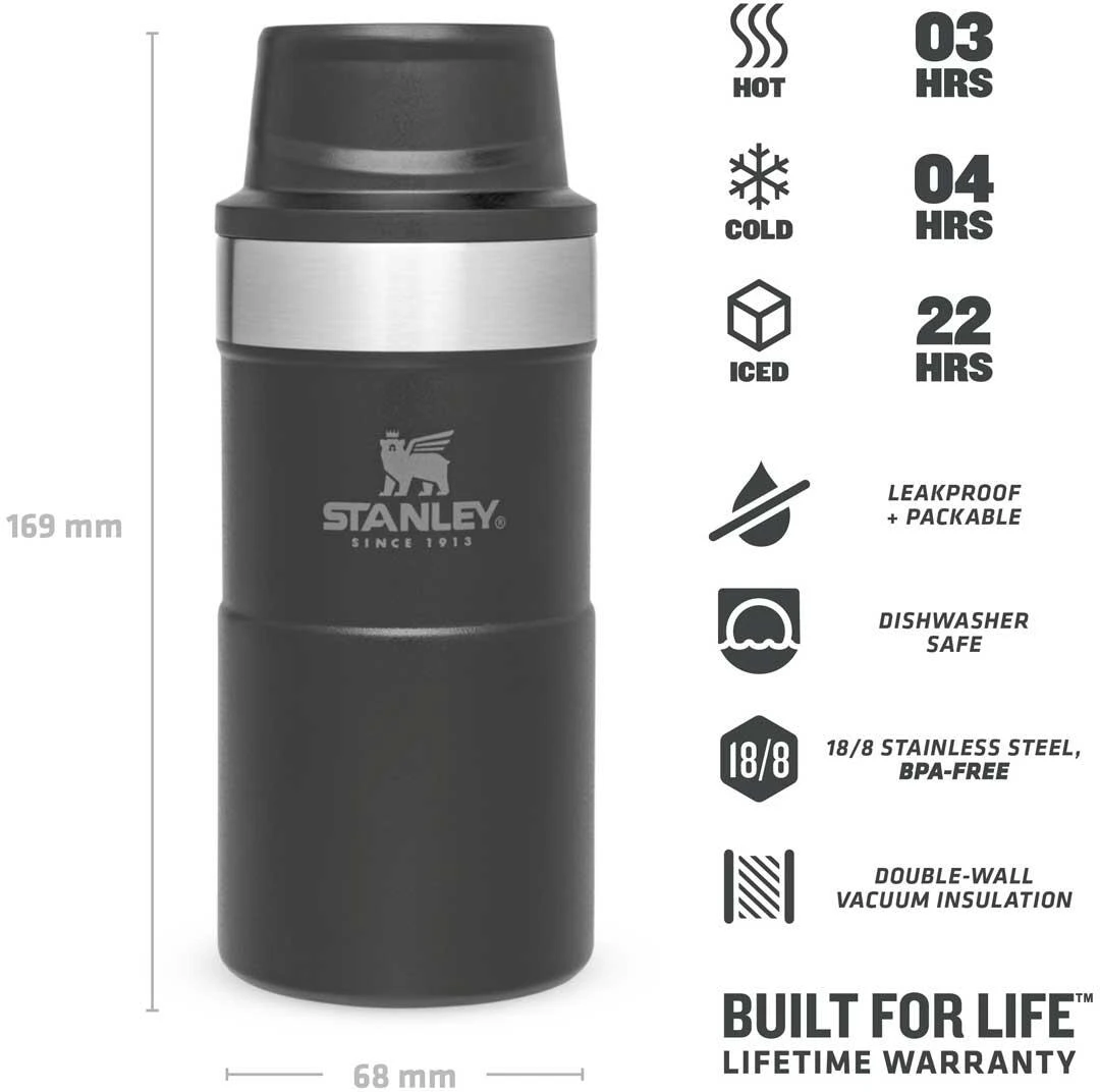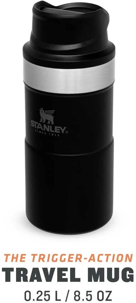 Mit der Slim Line Version des TRIGGER-ACTION TRAVEL MUG führt Stanley eine überarbeitete Version der einhändig bedienbaren Becher ein. Durch das neue, schlankere Design liegt der Becher noch angenehmer in der Hand und die 250ml-Variante passt unter die meisten Kaffee-Automaten. Das Drücken der großen und sehr leichtgängigen Taste zum Aktivieren der Trinköffnung mit einer Hand macht Trinken – on the go – zum Vergnügen. Der schwarze Trinkbecher aus rostfreiem 18/8-Edelstahl mit Vakuumisolierung besitzt ein Fassungsvermögen von 250 ml und hält Getränke bis zu 3 Stunden heiß oder 4 Stunden gekühlt. Der TRIGGER-ACTION TRAVEL MUG ist komplett spülmaschinenfest, auslaufsicher und passt in gängige PKW-Getränkehalter. BPA-frei.