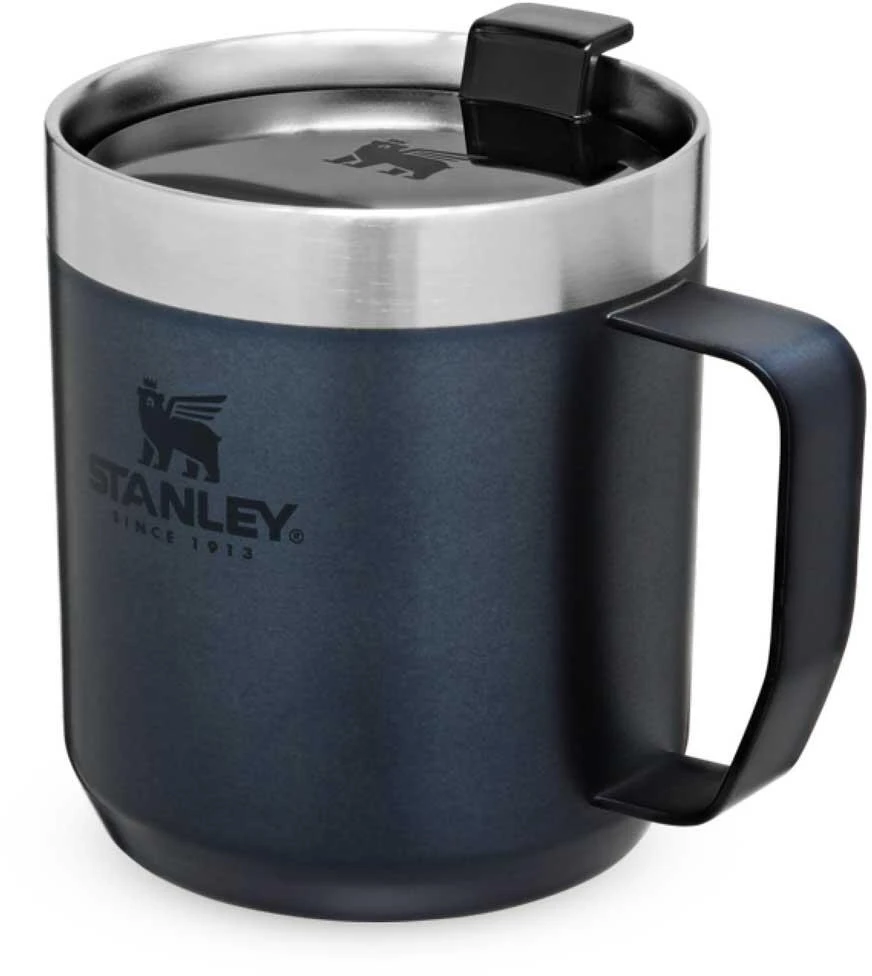 Der Stanley CLASSIC CAMP MUG im neuen Design hält mit seiner doppelwandigen Edelstahl-Vakuumisolierung heiße Getränke bis zu 1,5 Stunden heiß und kalte Getränke bis zu 3 Stunden kalt. Neu ist, dass der aus rostfreiem 18/8-Edelstahl hergestellte Trinkbecher jetzt einen durchsichtigen Deckel aus bruchfestem Tritan-Kunststoff besitzt, aus den es sich noch bequemer trinken lässt. Der mit Lackierung in Nightfall-Blue versehene CLASSIC CAMP MUG ist spülmaschinenfest und alle Teile sind BPA-frei.