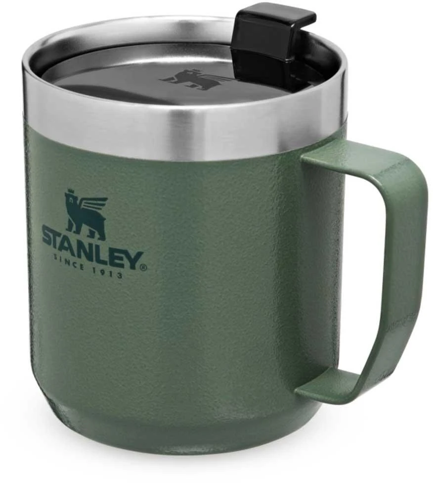 Der Stanley CLASSIC CAMP MUG im neuen Design hält mit seiner doppelwandigen Edelstahl-Vakuumisolierung heiße Getränke bis zu 1,5 Stunden heiß und kalte Getränke bis zu 3 Stunden kalt. Neu ist, dass der aus rostfreiem 18/8-Edelstahl hergestellte Trinkbecher jetzt einen durchsichtigen Deckel aus bruchfestem Tritan-Kunststoff besitzt, aus den es sich noch bequemer trinken lässt. Der mit hammerschlaggrüner Lackierung versehene CLASSIC CAMP MUG ist spülmaschinenfest und alle Teile sind BPA-frei.