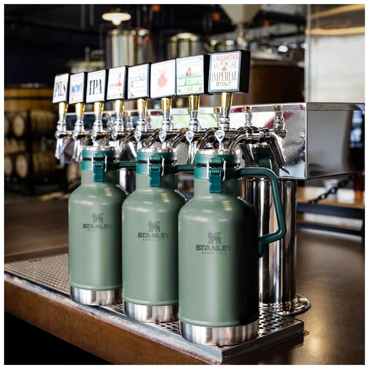 Der aus rostfreiem 18/8 Edelstahl gefertigte Stanley CLASSIC VACUUM BEER GROWLER ist mit einer schützenden, grünen Hammerschlaglackierung versehen. Die doppelwandige Vakuum-Isolation hält Getränke bis zu 18 Stunden heiß oder 24 Stunden kalt. Der seitlich montierte Kunststofftragegriff sorgt für den problemlosen Transport der Flasche. Der robuste Deckelverschluss hält auch kohlensäurehaltigen Getränken sicher Stand. Durch die 6 cm weite Öffnung lässt sich die Flasche sehr gut befüllen und reinigen. Alle Teile sind spülmaschinenfest und natürlich BPA frei. Fassungsvermögen 1,9 Liter.